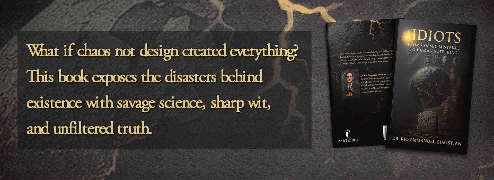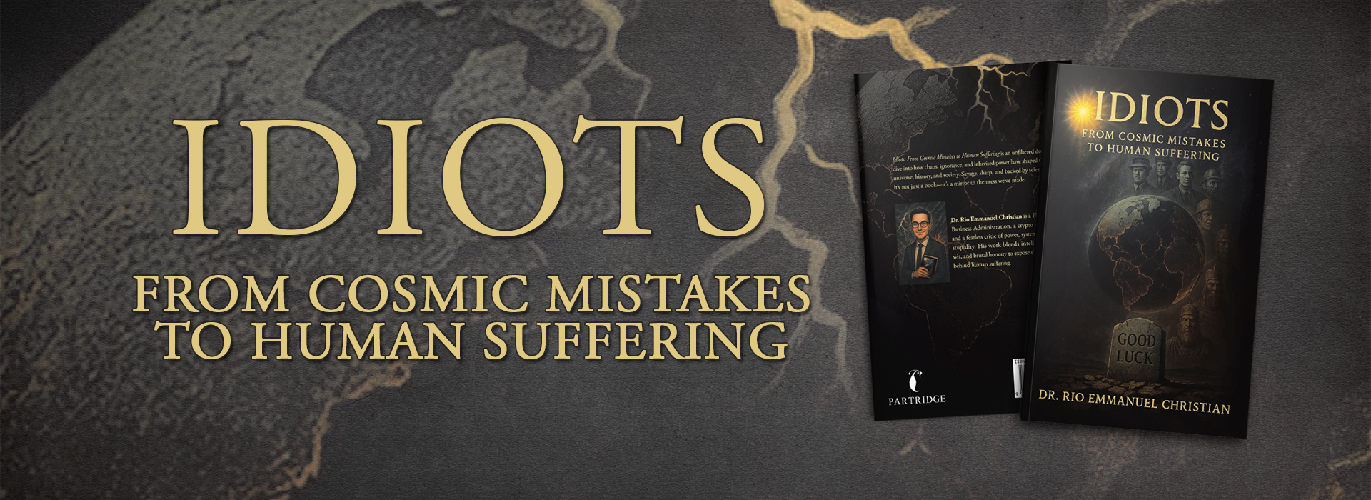 In Idiots, Dr. Rio Emmanuel Christian dissects cosmic, biological, and societal disasters, revealing a brutally honest truth: existence itself is built on mistakes. From the Big Bang to billionaires, from atom collisions to corporate greed, this is a darkly funny, fiercely intelligent exploration of why the world works the way it does — and how idiocy keeps it broken.